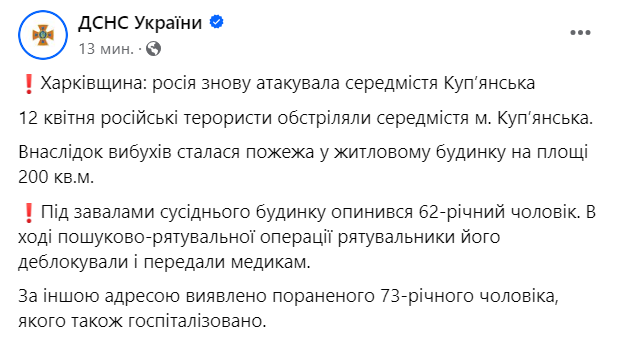 Вчера, 12 апреля, россияне в очередной раз ударили по Купянску Харьковской области. В результате взрывов произошел пожар в жилом доме на площади 200 кв.м.