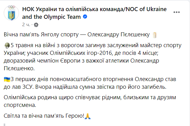 "С первых дней полномасштабного вторжения Александр стал в ряды ВСУ. Вчера пришло печальное известие о его гибели. Олимпийская семья искренне соболезнует родным, близким и друзьям спортсмена", - говорится в сообщении Национального олимпийского комитета Украины.