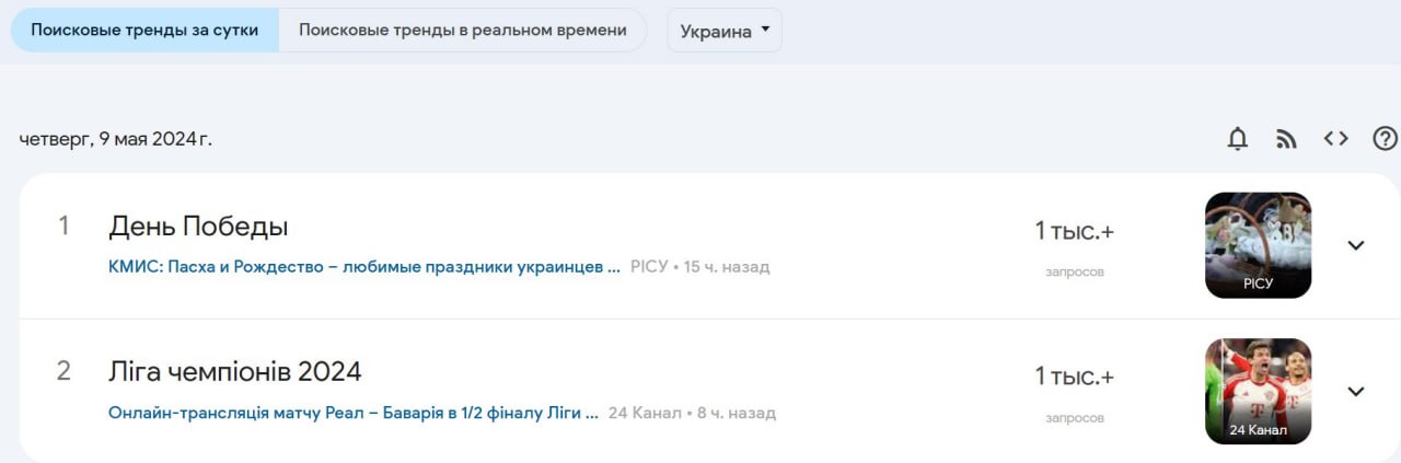 Но и в этом году жители Украины уже начинают активно искать информацию о Дне Победы в Google. Этот запрос - "День победы" - с утра стал самым популярным из Украины, по данным сервиса Google Trends.