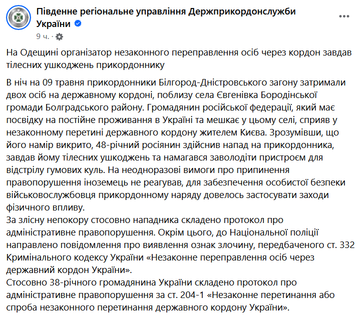 Об этом сообщает Южное региональное управление Государственной пограничной службы Украины на своей странице в Фейсбуке.
