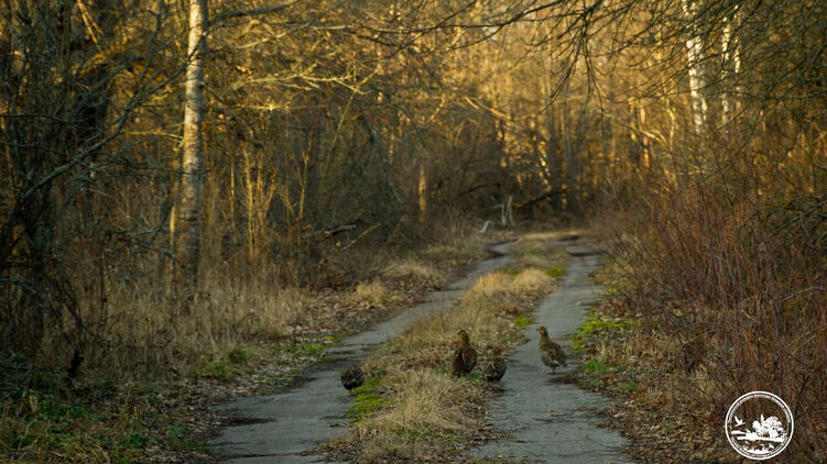 Остатки асфальтированных дорог доаварийного времени давно стали частью лесного ландшафта и частенько служат местным животным и тропинками, и местом отдыха, и даже небольшой столовой, особенно для пернатых. На фото стайка куропаток выискивает здесь то ли мелких насекомых, то ли семена растений. Вообще большую часть жизни эти птицы посвящают поиску пищи.