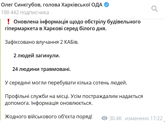 Об этом сообщают мэр города Игорь Терехов и глава Харьковской областной военной администрации Олег Синегубов в своих телеграм-каналах.