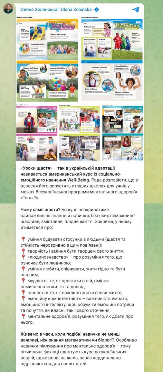 В основе уроков будет лежать американский курс по социально-эмоциональному обучению "Well-Being" (в переводе с английского - благополучие). Курс стартует в рамках курируемой женой президента Владимира Зеленского всеукраинской программы ментального здоровья "Ты как?".