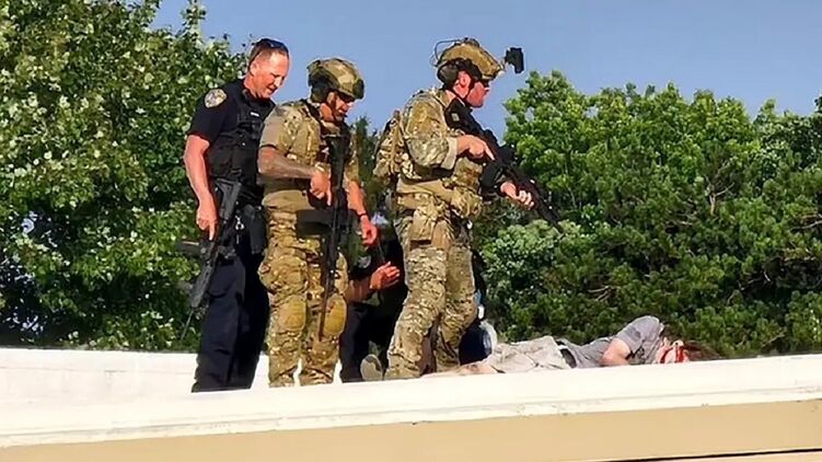 Затем окружающие люди начинают подзывать офицера и говорить о том, что на крыше какой-то человек, указывая на него руками. На этом видео обрывается.