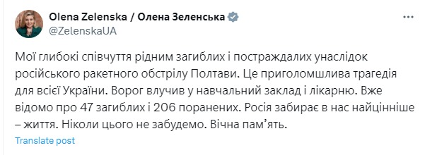 16:45 В Полтаве уже 47 погибших и 206 раненых после прилета по Институту связи, сообщает первая леди Елена Зеленская.
