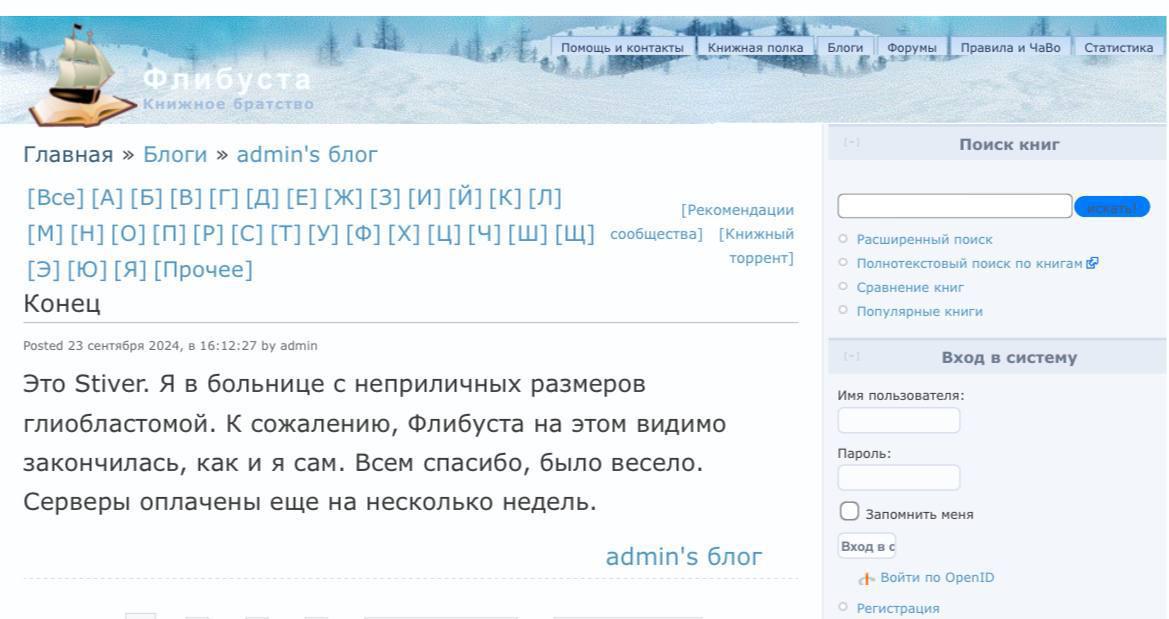 "К сожалению, "Флибуста" на этом видимо закончилась, как и я сам", - написал он.