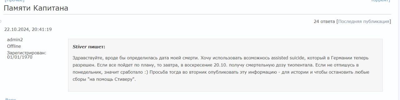 "Здравствуйте, вроде бы определилась дата моей смерти. Хочу использовать возможность assisted suicide (в переводе "помощь в самоубийстве", преднамеренная помощь человеку в самоубийстве - Ред.), который в Германии теперь разрешен. Если все пойдет по плану, то завтра, в воскресенье, 20 октября, получу смертельную дозу тиопентала. Если не отпишусь в понедельник, значит, сработало :) Просьба тогда во вторник опубликовать эту информацию — для истории и чтобы остановить любые сборы на помощь Стиверу", - сказано в публикации.