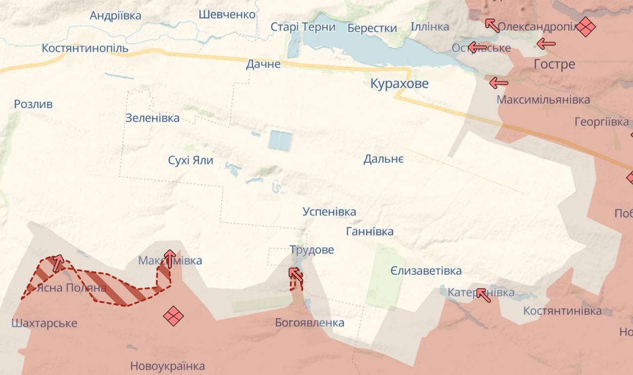 К северу от Курахово DS подтверждает продвижение РФ в сторону Вознесенки. Украинские же военные пишут, что "почти потеряно" село Ильинка.