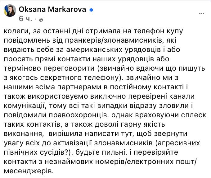 За последние дни ей поступило множество сообщений от лиц, выдававших себя за представителей американских властей. Они пытались получить контактные данные украинских чиновников или организовать "срочные" переговоры, заявляя о необходимости использовать "секретные" каналы связи.