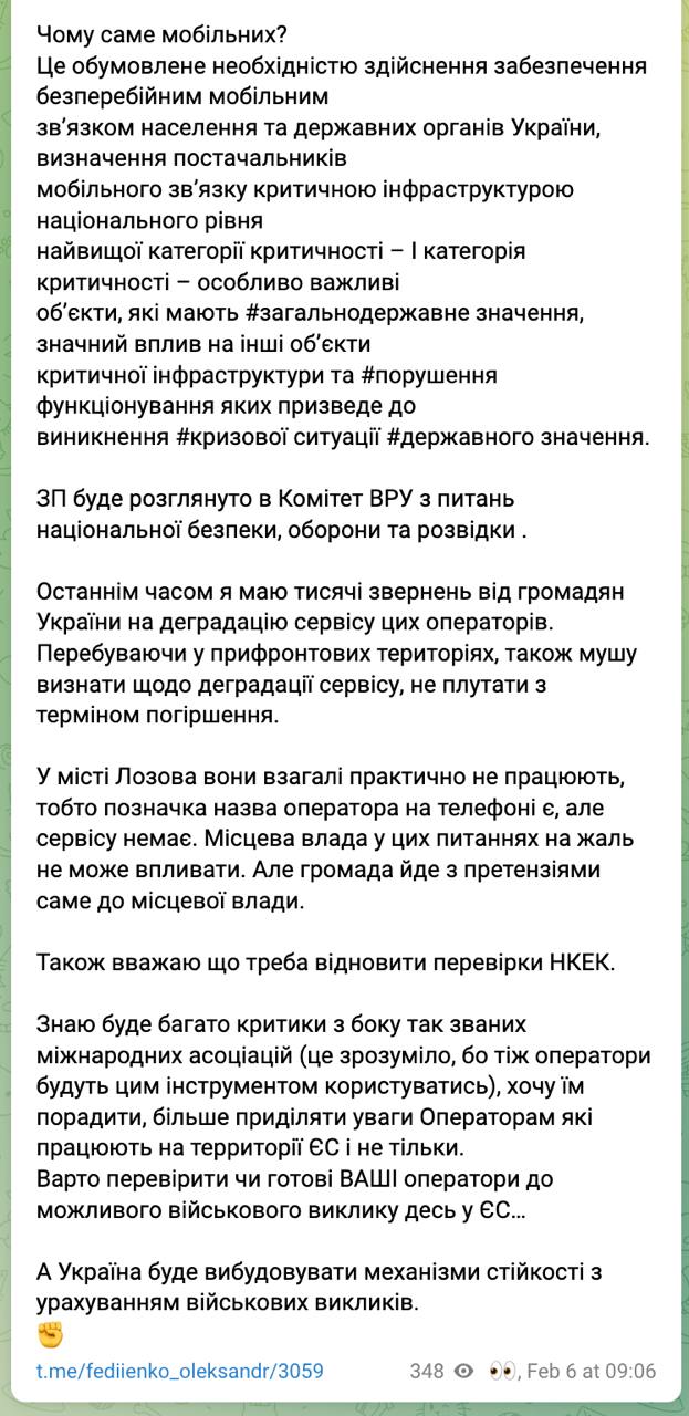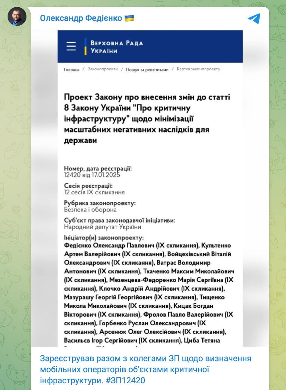 "Это обусловлено необходимостью осуществления обеспечения бесперебойным мобильным связью населения и государственных органов Украины", - пишет нардеп.