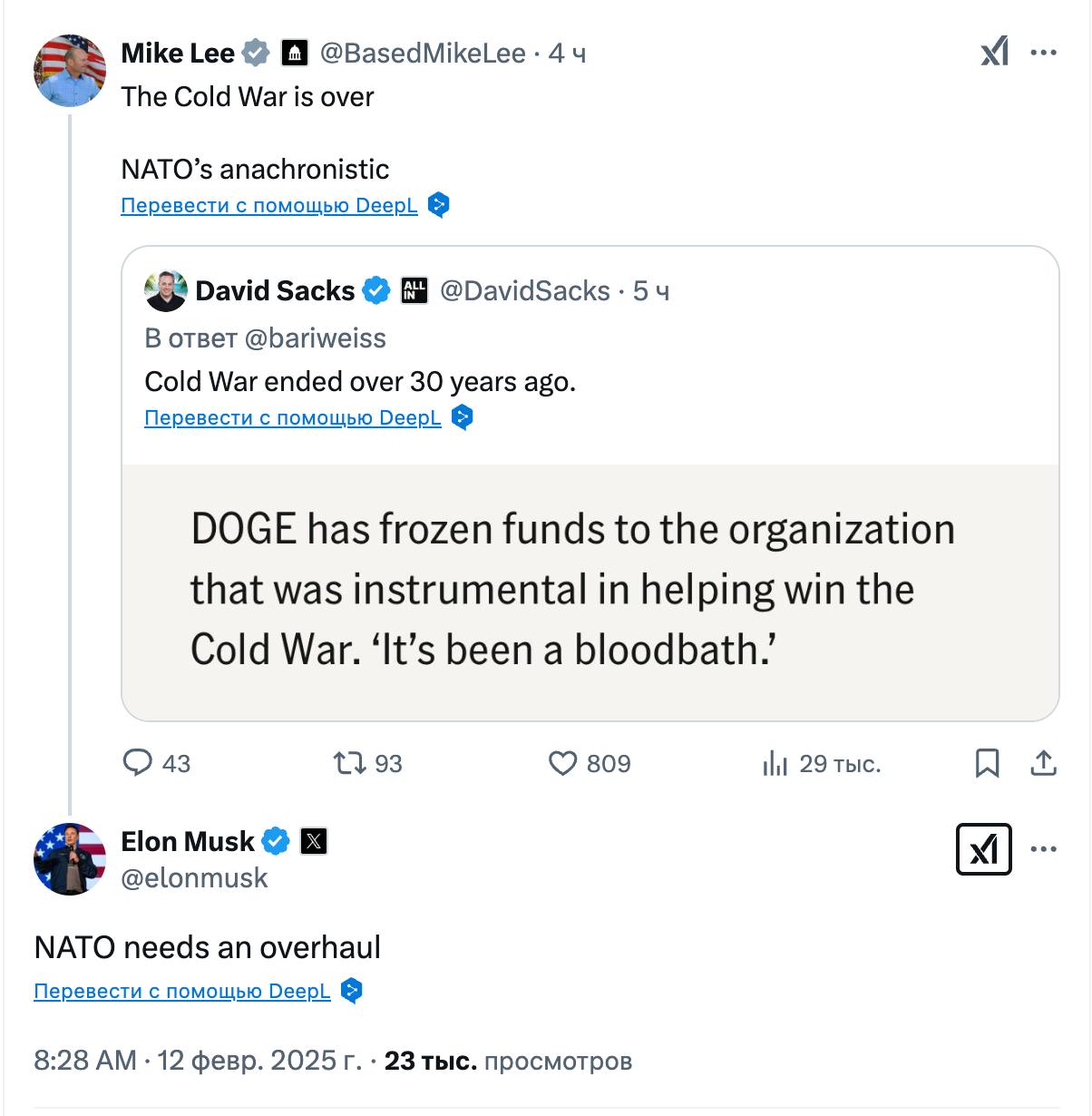 Глава Департамента эффективности правительства США (DOGE) Илон Маск призвал к полной реорганизации Североатлантического альянса НАТО.