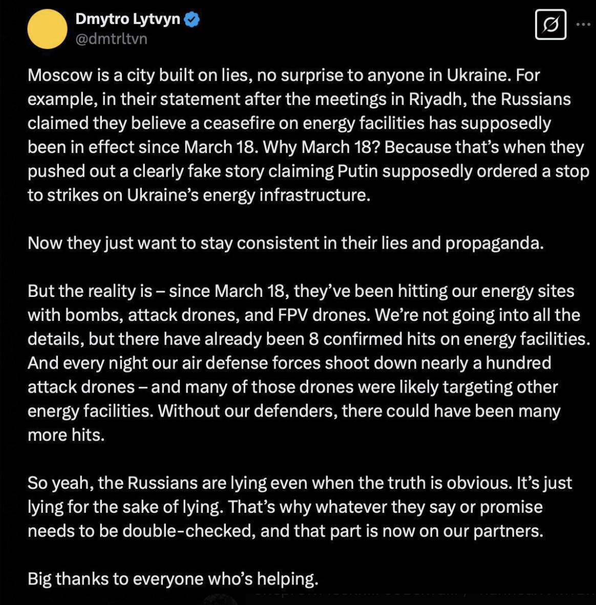 С 18 марта, когда президент РФ Владимир Путин сообщил о своем приказе прекратить атаки против украинской энергетики, Россия нанесла восемь новых ударов.