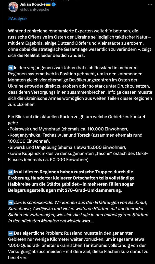 "Это развитие событий ясно показывает: наступление на востоке ни в коем случае не является просто тактическим, но имеет потенциал привести к стратегическому прорыву в ближайшие месяцы", - добавил Репке.