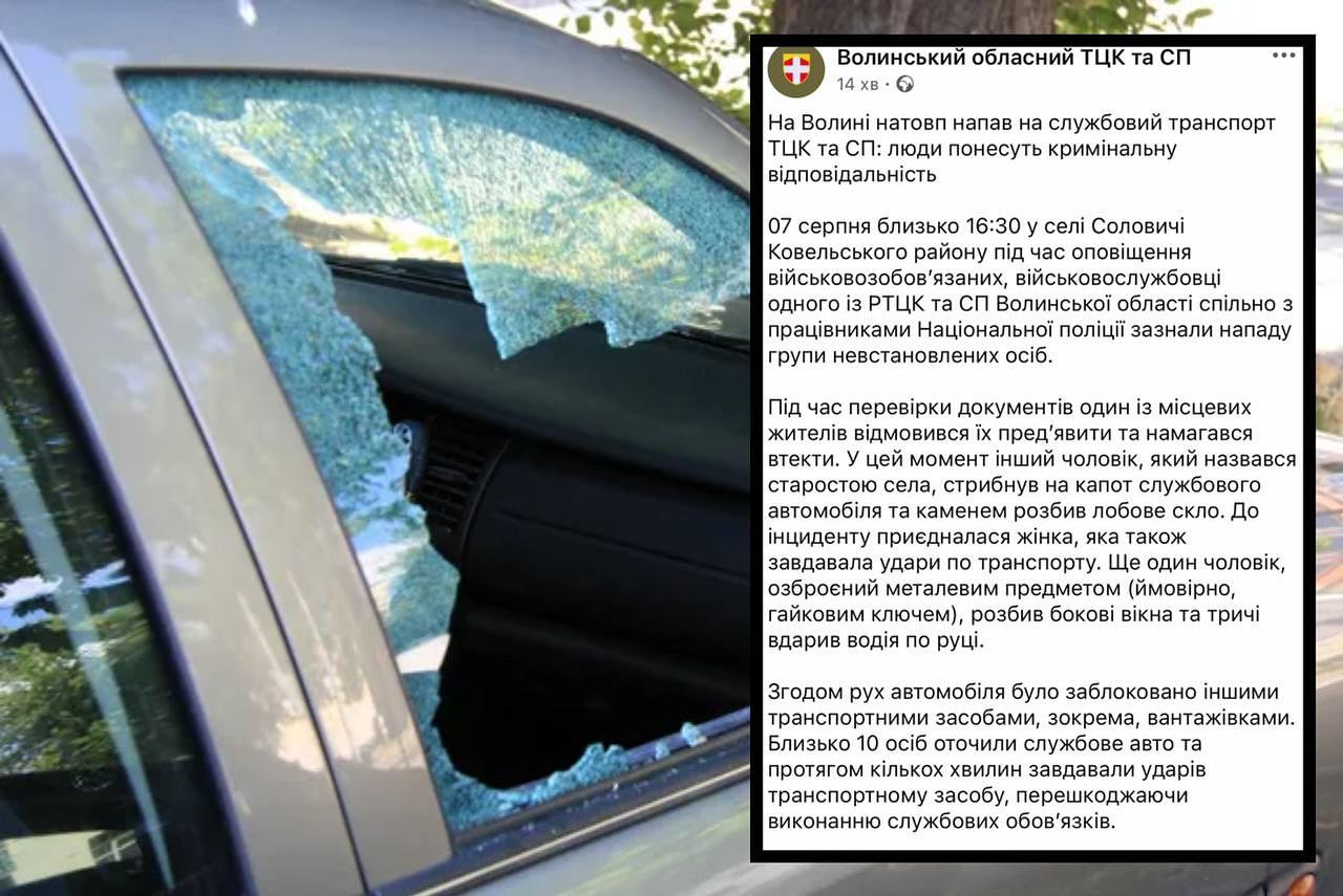 13:59 Волынский ТЦК сообщает о нападении гражданских лиц на его автомобиль в селе Соловичи. В нападении участвовал и староста села.