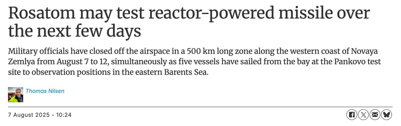 15:01 В ближайшие дни Россия может испытать межконтинентальную ракету "Буревестник" с ядерной энергетической установкой на Новой Земле, сообщает The Barents Observer.