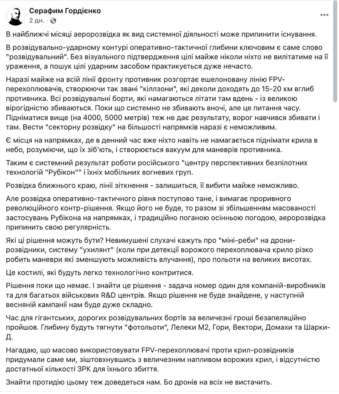 "Пока что системно не сбивают ночью, но это вопрос времени. Подниматься выше (на 4000, 5000 метров) тоже не дает результата, враг научился сбивать и там. Вести "секторную разведку" на большинстве направлений пока что невозможно", - пишет Гордиенко.