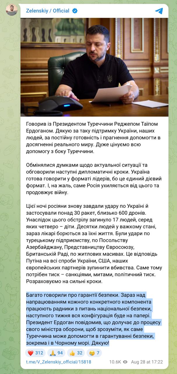 "Многие говорили о гарантиях безопасности. Сейчас над наработкой каждого конкретного компонента работают советники по национальной безопасности, на следующей неделе вся конфигурация будет на бумаге", - пишет Зеленский после переговоров с Эрдоганом.