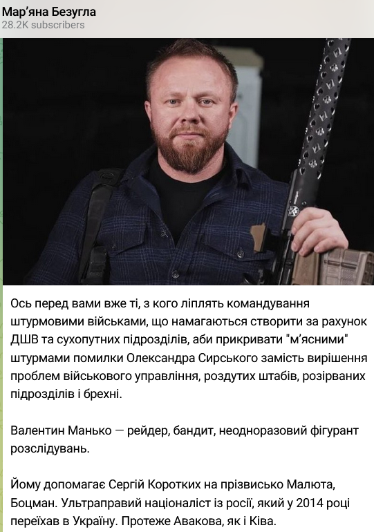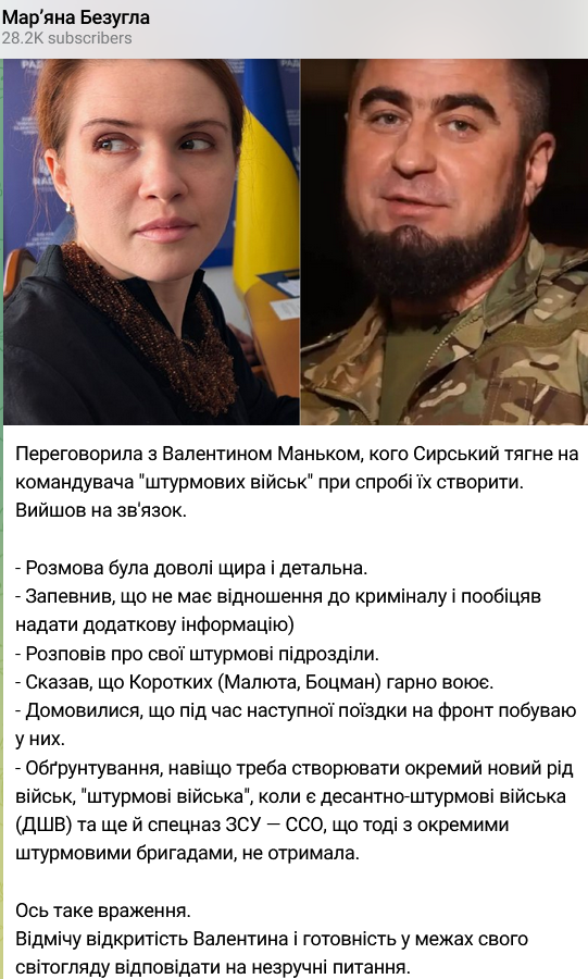 Народный депутат Марьяна Безуглая раскритиковала недавно назначенного командующего штурмовыми войсками Вооруженных сил Украины полковника Валентина Манько.