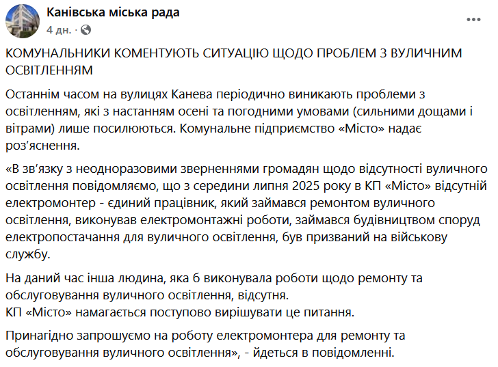"С середины июля 2025 года в КП "Город" отсутствует электромонтёр – единственный работник, который занимался ремонтом уличного освещения, выполнял электромонтажные работы, занимался строительством сооружений для уличного освещения, был призван на военную службу. В настоящее время другой человек, который выполнял бы работы по ремонту и обслуживанию уличного освещения, отсутствует", - сообщили в горсовете.