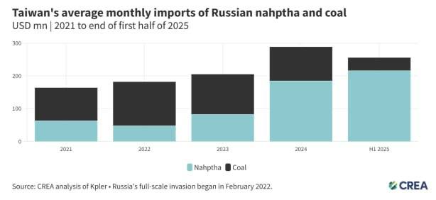 Согласно опубликованному отчёту, в первой половине 2025 года Тайвань импортировал российскую нафту на сумму 1,3 млрд долларов, а среднемесячный объём импорта достиг уровня, почти в шесть раз превышающего средний показатель 2022 года. По сравнению с первой половиной 2024 года импорт нафты на Тайвань в этом году увеличился на 44%.
