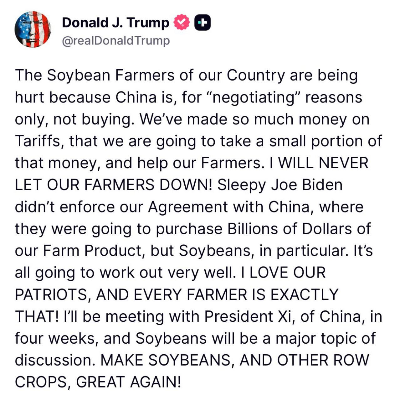 "Фермеры соевых бобов в нашей стране страдают, потому что Китай, исключительно по "переговорным" причинам, не покупает. Мы заработали так много на тарифах, что собираемся использовать небольшую часть этих средств, чтобы помочь нашим фермерам. Я никогда не подведу наших фермеров! Сонный Джо Байден не обеспечил соблюдение нашего соглашения с Китаем, по которому они должны были приобрести на миллиарды долларов нашей сельхозпродукции, особенно соевых бобов. Всё это сложится очень хорошо. Я люблю наших патриотов, и каждый фермер – именно такой! Через четыре недели я встречусь с президентом Си из Китая, и соевые бобы станут одной из основных тем обсуждения. Сделаем соевые бобы и другие зерновые культуры великими снова!" – сообщил Трамп.