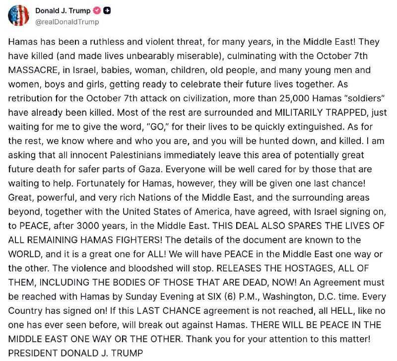 Он отметил, что предложенный им мирный план «сохраняет жизни всех оставшихся боевиков ХАМАС», а соглашение должно быть достигнуто до воскресенья, 18:00 по Вашингтону (01:00 понедельника по Киеву).