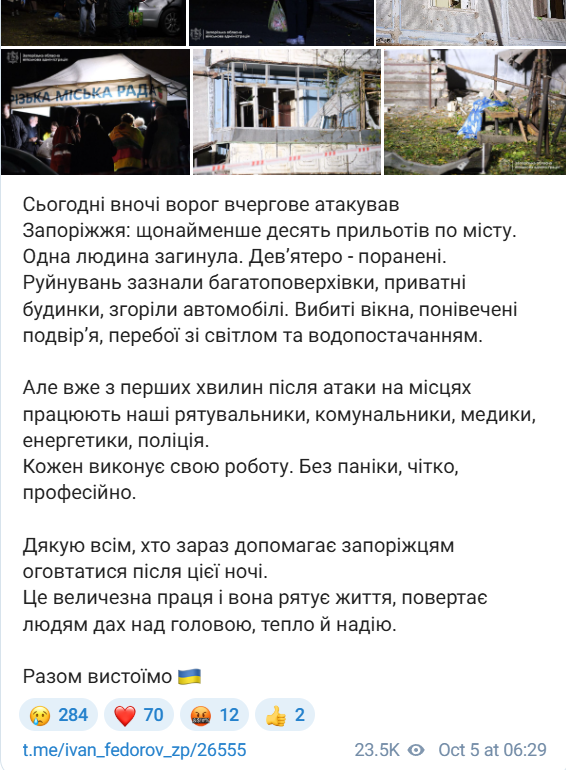 В ночь на 5 октября Россия нанесла массированный комбинированный удар по Запорожью. Зафиксировано не менее десяти попаданий.