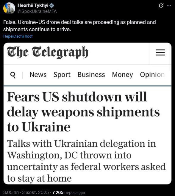 "Это неправда. Переговоры между Украиной и США по соглашению о БПЛА идут по плану, и поставки продолжают поступать", – написал Тихий.
