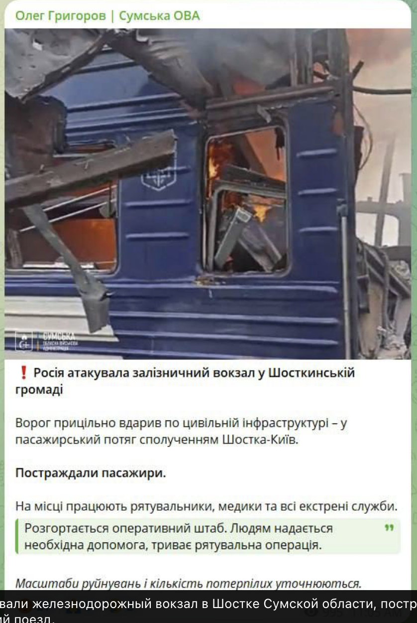 12:15 Дроны атаковали железнодорожный вокзал в Шостке Сумской области, пострадал пассажирский поезд.