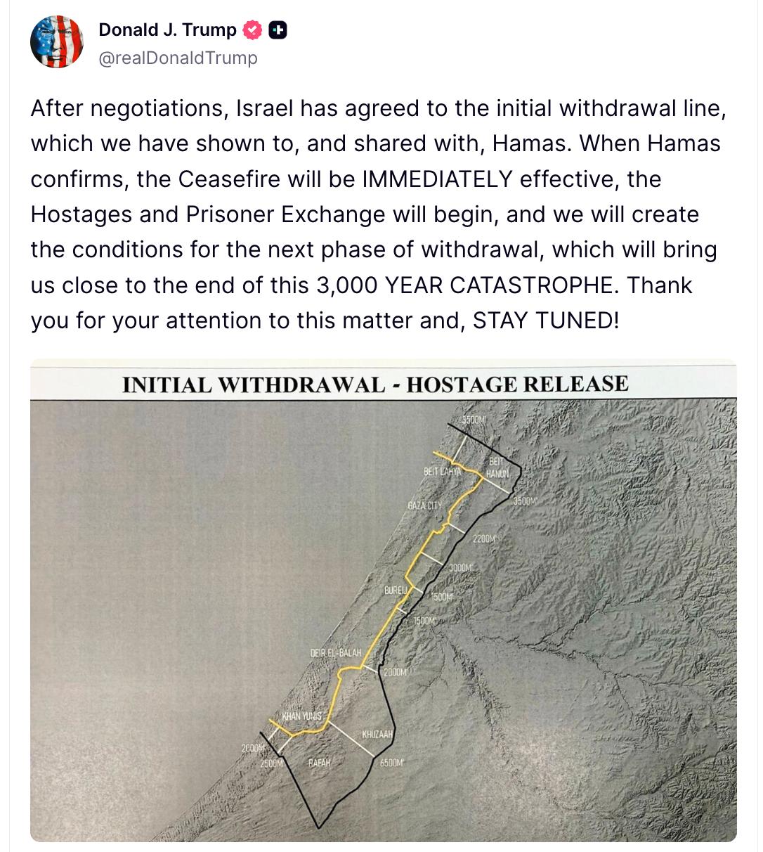 "После переговоров Израиль согласился на первоначальную линию отвода, которую мы показали и передали ХАМАС. Когда ХАМАС подтвердит, режим прекращения огня будет немедленно введён в действие, начнётся обмен заложниками и заключёнными, и мы создадим условия для следующего этапа отвода, который приблизит нас к завершению этой 3000-летней катастрофы", – написал президент США.