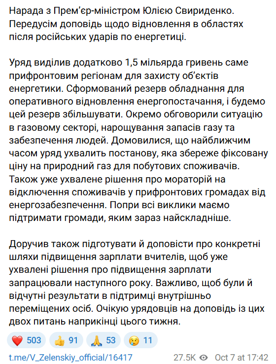"Правительство выделило дополнительно 1,5 миллиарда гривен именно прифронтовым регионам для защиты объектов энергетики. Сформирован резерв оборудования для оперативного восстановления энергоснабжения и будем этот резерв увеличивать. Договорились, что в ближайшее время правительство примет постановление, сохранившее фиксированную цену на природный газ для бытовых потребителей. Также уже принято решение о моратории на отключение потребителей в прифронтовых общинах от энергообеспечения", - сообщает президент.