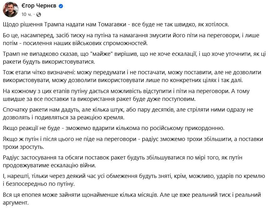 "Скорее всего, поставки и использование ракет будут очень постепенными. На каждом из этих этапов Путину дадут возможность отступить и пойти на переговоры. Сначала ракеты нам дадут, но всего несколько штук или пару десятков. Но стрелять ими сразу не позволят — будут смотреть на реакцию Кремля. Если реакции не будет — сможем ударить несколькими по российскому приграничью. Если же Путин и после этого не пойдёт на переговоры — радиус можно будет немного увеличить, а поставки немного вырастут. Радиус применения и объёмы поставок ракет будут увеличиваться по мере того, как Путин будет продолжать эскалацию войны. И, наконец, только через какое-то время все ограничения будут сняты, кроме, возможно, ударов по Кремлю и непосредственно по Путину. Вся эта эпопея может занять как минимум несколько месяцев", - написал Чернев в Фейсбуке.