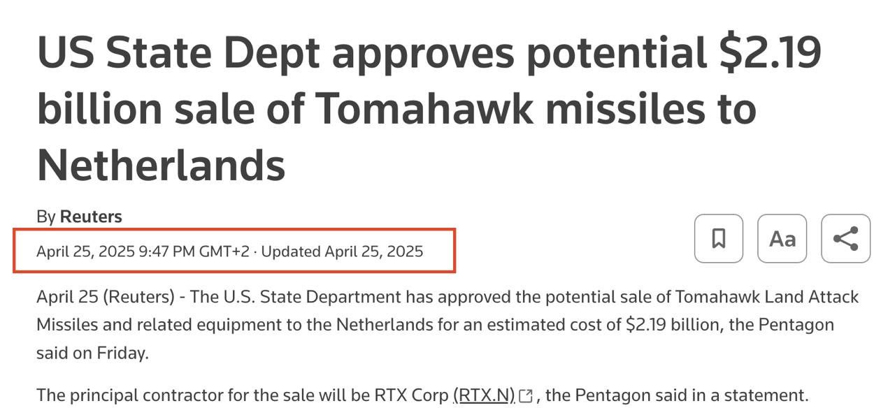 Единственное упоминание о решении США продать "Томагавки" Нидерландам в количестве 175 ракет на сумму 2,19 миллиарда долларов датировано ещё 25 апреля 2025 года, когда речь о поставах таких ракет Украине вообще не шла.