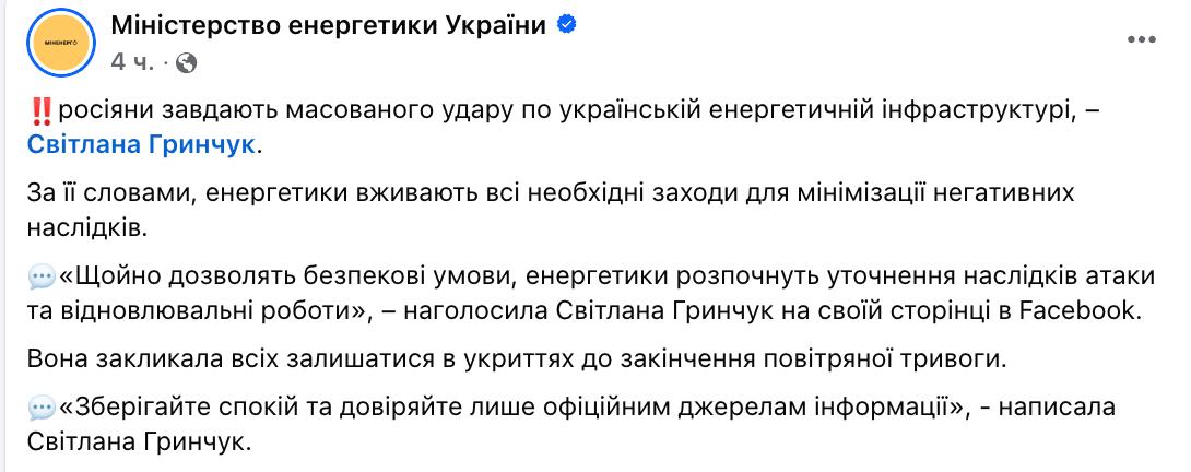 07:50 Россия ночью нанесла массированный удар по энергетике, сообщает Минэнерго.