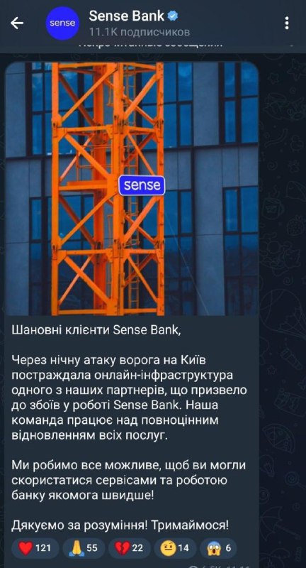 14:16 Мобильное приложение государственного Sense Bank не работает, а его сайт грузится через раз. Банк уже сделал заявление на этот счет, объяснив технические проблемы ночной дроново-ракетной атакой на Киев.