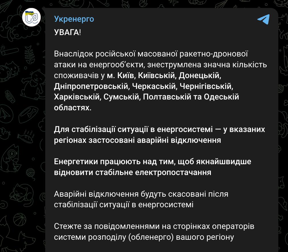 По данным местных властей, аварийные отключения света начались в Киеве, Харькове, Полтавской и Сумской областях.