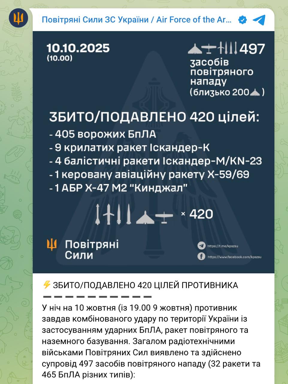 10:23 По Украине ночью запустили 497 воздушных целей, было 73 прилета, сообщают Воздушные силы.