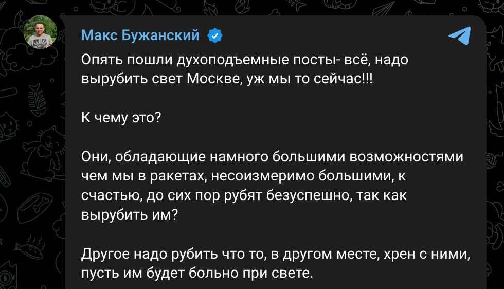 "Опять пошли духоподъемные посты: всё, надо вырубить свет Москве, уж мы-то сейчас! К чему это? Они, обладающие намного большими возможностями, чем мы, в ракетах, несоизмеримо большими, к счастью, до сих пор рубят безуспешно, так как вырубить им?" - написал "слуга народа" Максим Бужанский.