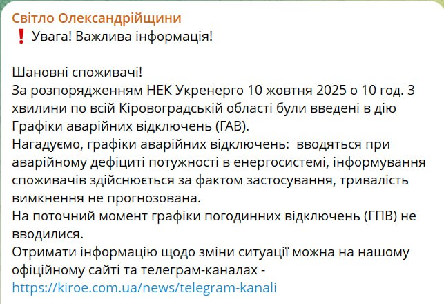 19:27 В Кировоградской области введены графики отключений света, сообщает Кировоградоблэнерго.