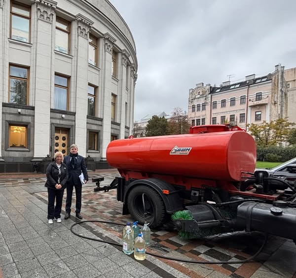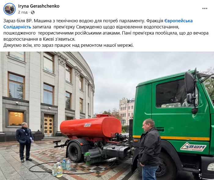 По её словам, в Верховную Раду была подана цистерна с технической вода для базовых нужд парламента. Из цистерны сотрудники Рады набирали воду в пятилитровые бутыли из-под питьевой воды. Кроме того, в правительственный квартал Киева, но уже к зданию Кабинета министров доставили биотуалеты.