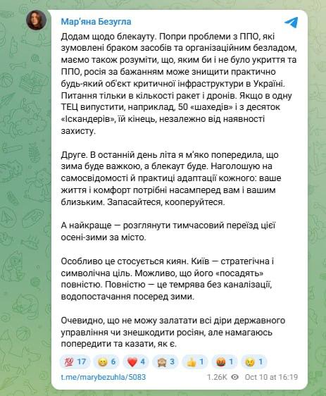 Народный депутат Марьяна Безуглая рекомендует жителям городов Украины, особенно Киева, куда-то переехать на время осени и зимы. Она допускает полный блэкаут.