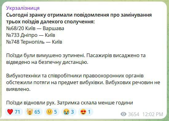 13:23 Сегодня утром в Укрзализныцю поступило сообщение о минировании трех поездов.