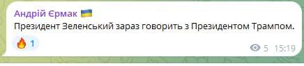 15:20 Зеленский сейчас говорит с Трампом, пишет Ермак.