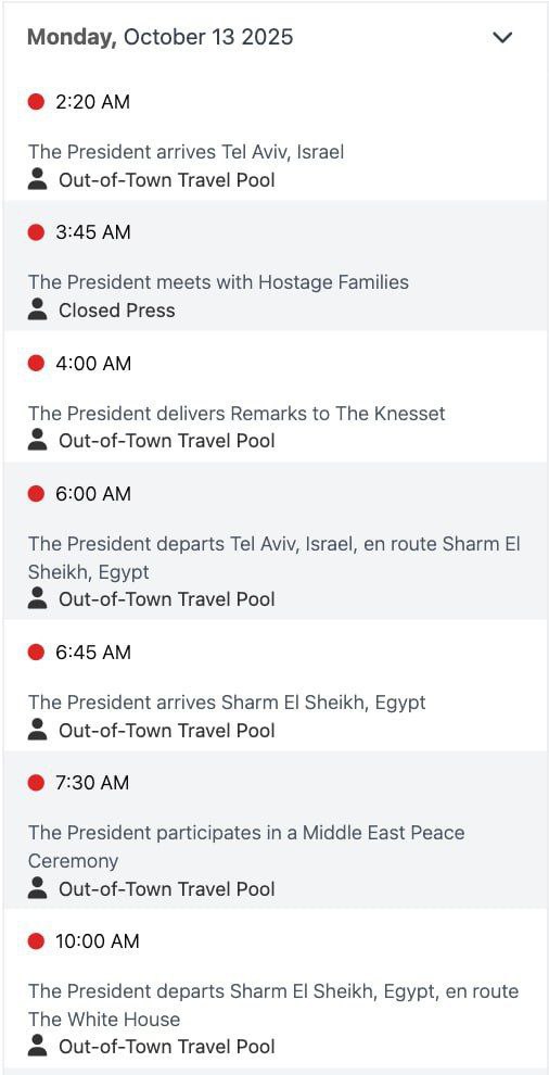 "В 13:30 того же дня президент США отправится из Израиля в египетский Шарм-эш-Шейх. Там он примет участие в церемонии формального утверждения мирного соглашения между Израилем и ХАМАСом. После этого глава Белого дома вылетит в Вашингтон", - говорится в обнародованном Белым домом графике.