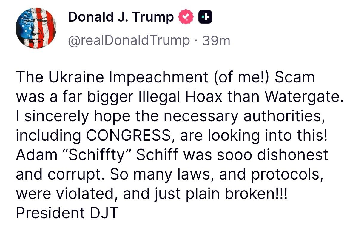 "Украинский импичмент (в отношении меня!) был гораздо более незаконным обманом, чем Уотергейт. Я искренне надеюсь, что соответствующие органы, включая конгресс, расследуют это! Адам Шифф был настолько нечестным и коррумпированным. Было нарушено и попросту попрано столько законов и процедур!" – написал президент США.