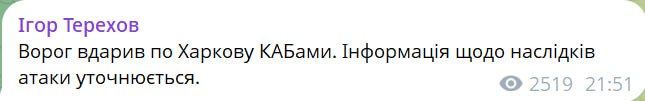 21.54 В Харькове прилеты КАБ, сообщил мэр Терехов.