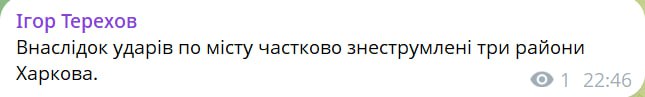 22.49 После ударов по Харькову частично обесточены три района, сообщил мэр Терехов.