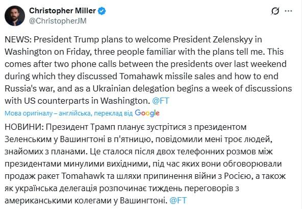 "Президент Трамп планирует встретиться с президентом Зеленским в Вашингтоне в пятницу, передали мне трое людей, знакомых с планами. Это случилось после двух телефонных разговоров между президентами на прошлых выходных, во время которых они обговаривали продажу ракет "Томагавк" и пути остановки войны с Россией, а так же о том, как украинская делегация начинает неделю переговоров с американскими коллегами в Вашингтоне", - говорится в сообщении.