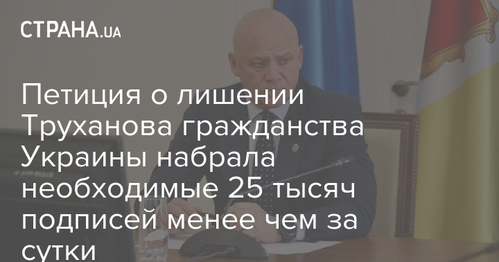 Петиция с требованием лишить гражданства Украины мэра Одессы Геннадия Труханова менее чем за сутки набрала более 25 тысяч подписей, необходимых для рассмотрения президентом Владимиром Зеленским.