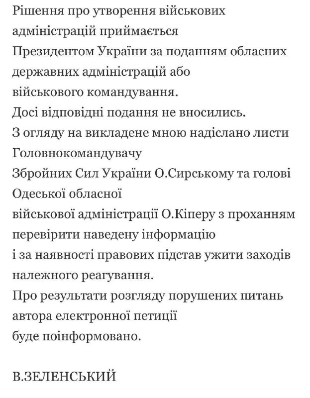 "До сих пор соответствующие представления не вносились. Учитывая изложенное, мною отправлены письма главнокомандующему Сырскому и председателю Одесской областной военной администрации Киперу с просьбой проверить приведенную информацию и при наличии правовых оснований принять меры надлежащего реагирования", - сказано в ответе Зеленского.